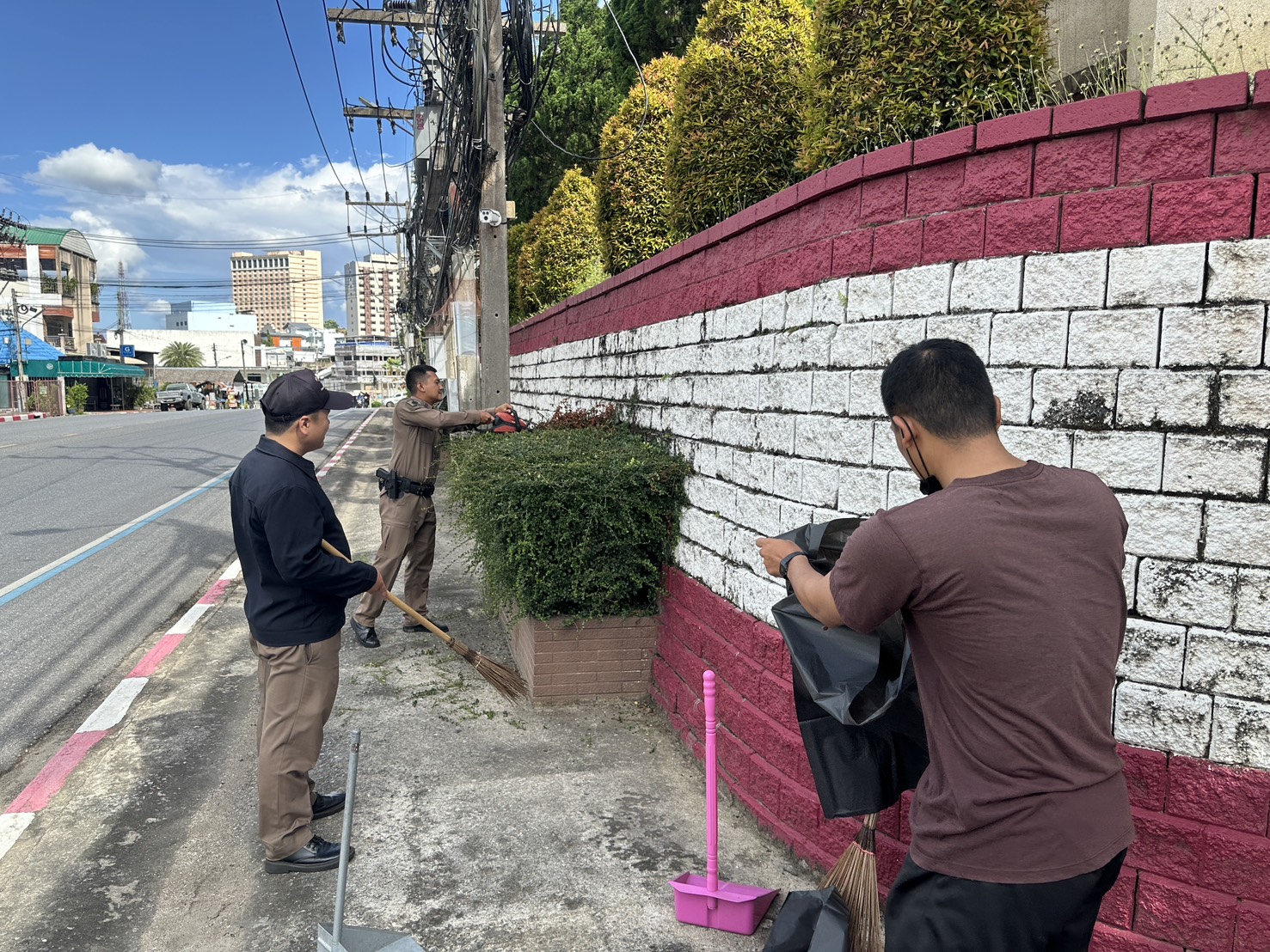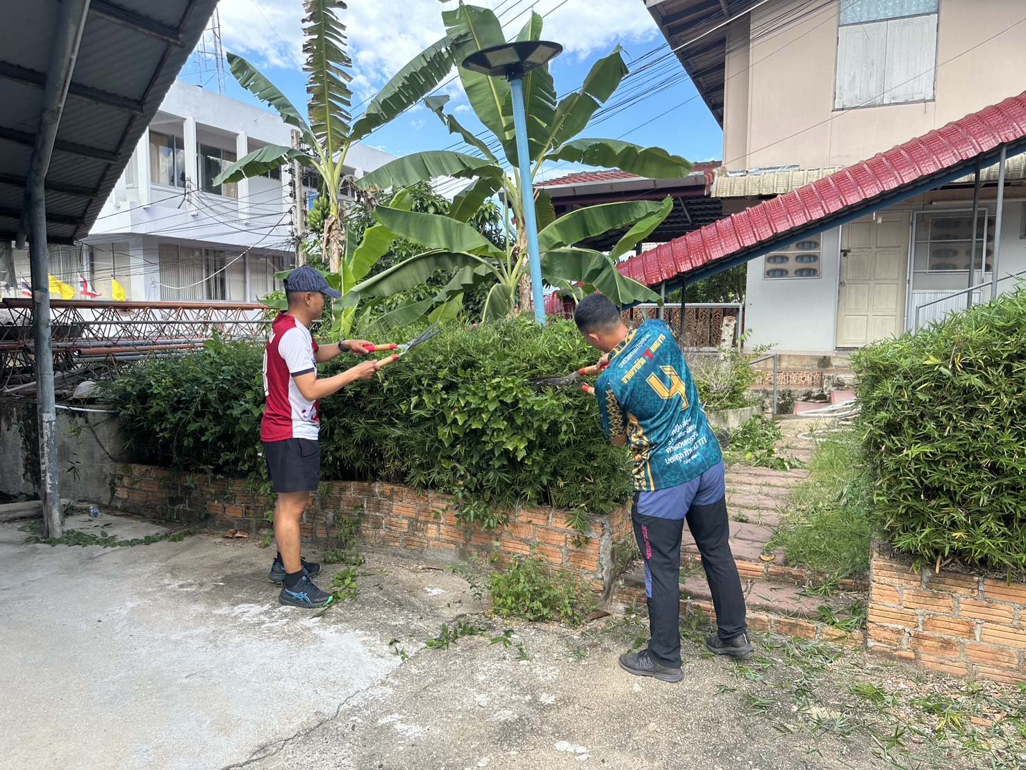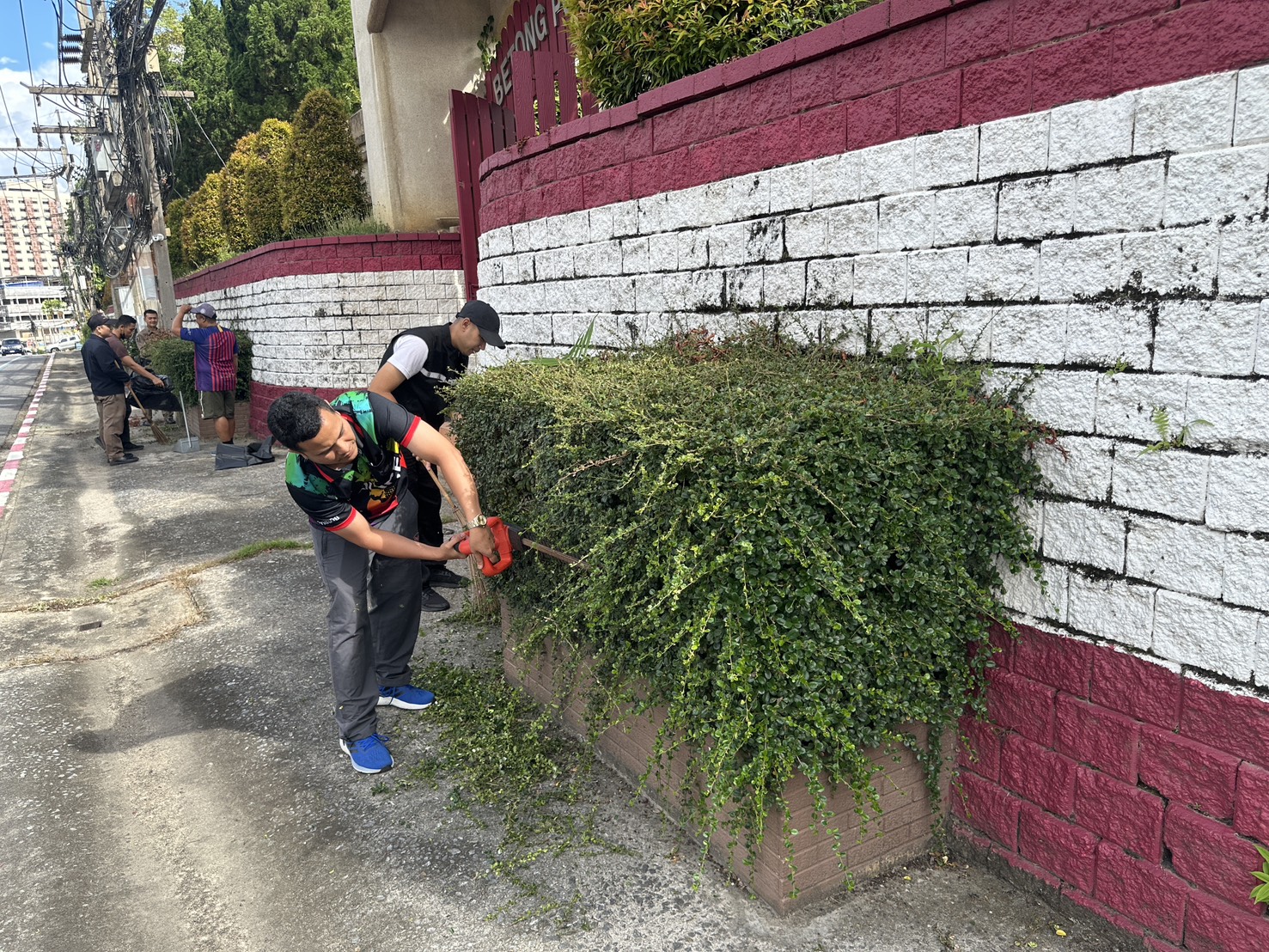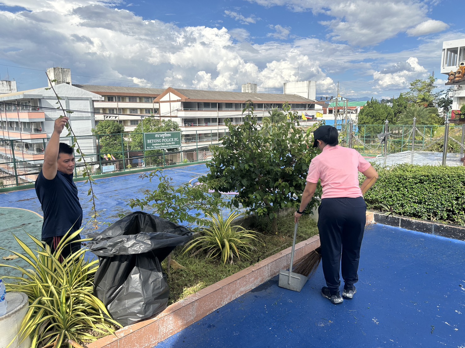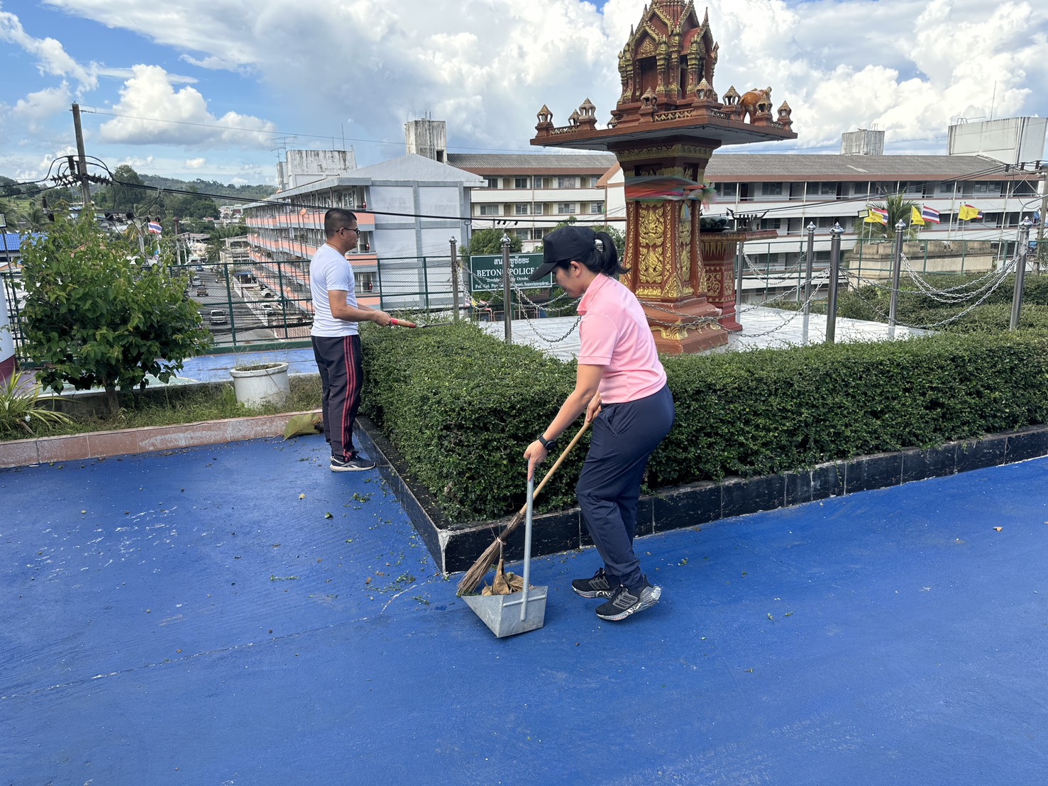 พร้อมด้วยข้าราชการตำรวจ สภ.เบตง ร่วมทำความสะอาด ตัดแต่งกิ่งไม้และเก็บเศษขยะ และถอนหญ้าที่ขึ้นรกทึบ บริเวณโดยรอบสถานีตำรวจภูธรเบตง บ้านพัก ข้าราชการตำรวจ