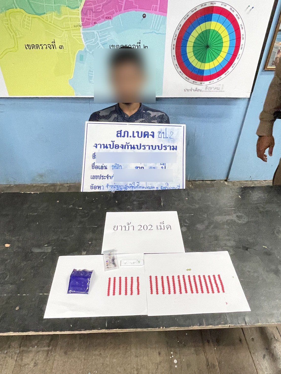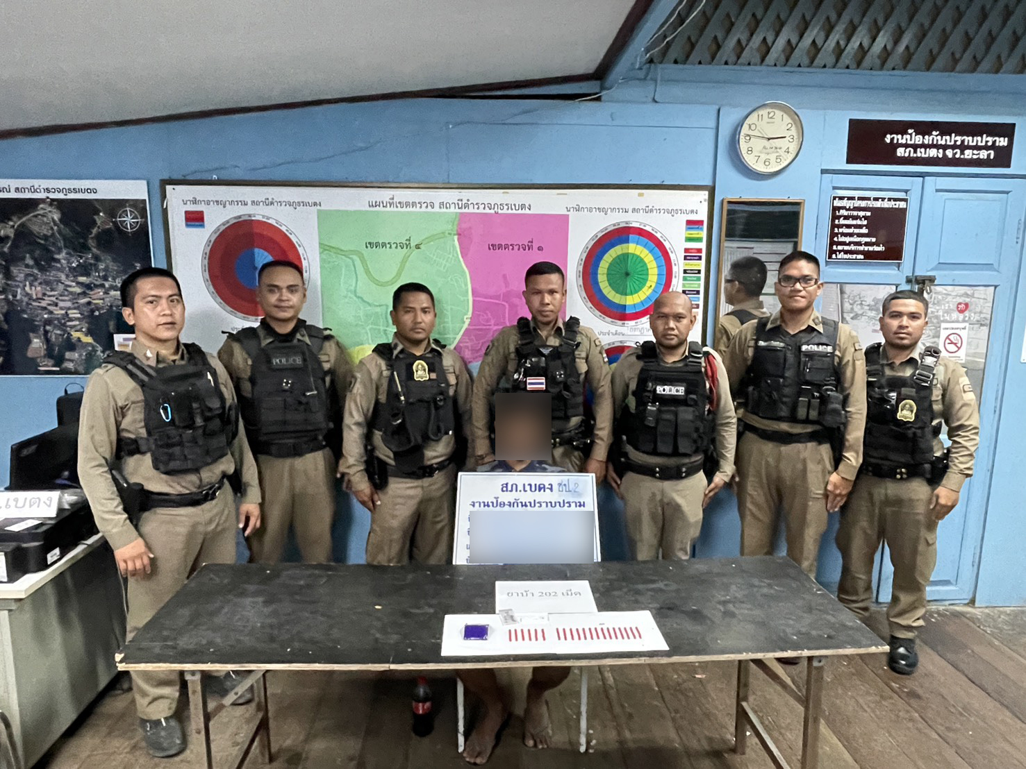 ตำรวจสายตรวจเบตงจับยาบ้า 200 เม็ด 30 ตุลาคม 2568 โดย Admin_Run / ข่าวภารกิจผู้บังคับบัญชา,ข่าวประชาสัมพันธ์,งานป้องกันปราบปราม,งาน ป. (ต.ค.) วันที่ 30 ต.ค. 68 เวลาประมาณ 00.40 น. ร.ต.อ.สินชัย บาฮา รอง สวป.สภ.เบตง เจ้าพนักงาน ป.ป.ส.เลขประจำตัว ๖๖๐๗๐๔๒ พร้อมด้วย ชุดสายตรวจจักรยานยนต์ ขณะตั้งด่านตรวจสอบบุคคลและสิ่งผิดกฏหมายได้ตรวจพบ ของกลางลำดับที่ ๕ ยาเสพติดให้ให้โทษประเภท ๑ เมทแอมเฟตามึน ( ยาบ้า ) ชนิดเม็ดกลมแบนสีแดง ประทับตัวอักษร (WY ) จำนวน ๒๐๐ เม็ด และชนิดเม็ดกลมแบมแบนสีเขียว จำนวน ๒ เม็ด รวมยาบ้าบ้าจำนวน ๒๐๒ เม็ด โดยบรรยุใน ถุงพลาสติกสีน้ำเงินอมม่วงแบบกดปิดดึงเปิด ชั่งน้ำหนักรวมบรรจุภัณฑ์ประมาณ ๑๘.๑๘ กรัม ร่วมกันทำการจับกุมตัว ชายต้องสงสัยรายดังกล่าว เจ้าพนักงานชุดจับกุมจึงได้ควบคุมตัวชายคนดังกล่าว ส่งมอบตัวให้พนักงานสอบสวนเพื่อดดำเนินการต่อไป Facebook iconFacebookTwitter iconTwitterLINE iconLine