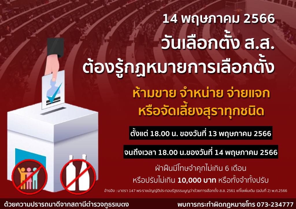 ห้ามจำหน่ายสุราในช่วงเลือกตั้ง 13 พฤษภาคม 2566 โดย Admin_Run / ข่าวประชาสัมพันธ์,ข่าวฝากประชาสัมพันธ์ Facebook iconFacebookTwitter iconTwitterLINE iconLine